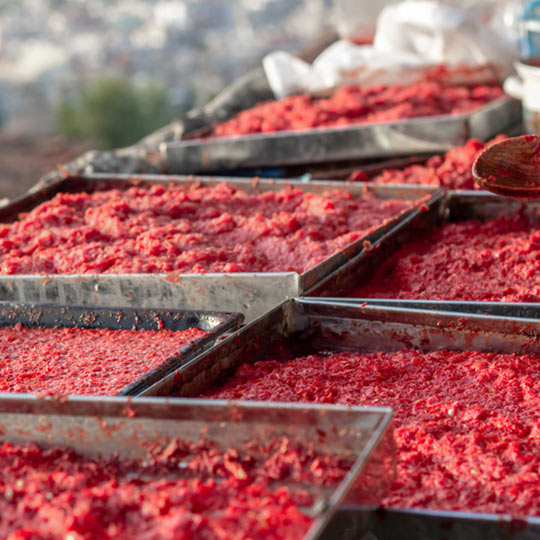 Baş biberi ile ünlü Hatay’ın biberlerinin güneşte kurutulması ile yapılan acı biber salçası daha sonra dövme ve ezme işlemelerinden geçirilerek tuzlanır. Birkaç gün üzeri tülbentlerle kapatılarak bekletilen ürün tam kıvamına gelene kadar havanın sıcaklığına göre üzeri açılıp kapatılarak adeta bir bebek gibi bakılarak en lezzetli kıvamına gelene kadar beklenir ve şişelenir…